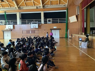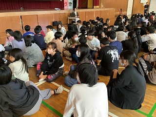 保健委員の児童がアンケート結果の報告をしたあと、半田市福祉部健康課 保健師 木暮かをり様に「こころを大悦インする方法 ~幸せになるためにストレスと上手に向き合おう~」をテーマに講話をしていただきました。