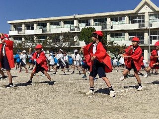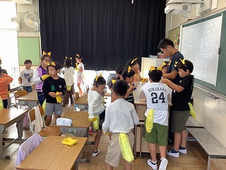 2年生学活 こぎつね耳やしっぽをつけてみました。運動会当日の演舞が楽しみです。