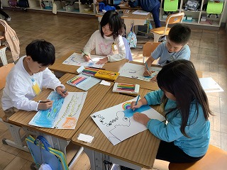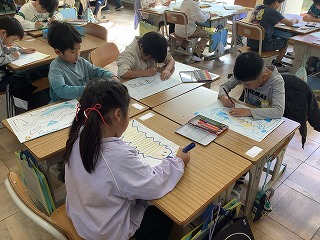 1年生図工 「せんのぼうけん」いろいろな線から、紙いっぱいに自分の思いを表現しました。「せんのぼうけん」楽しんでいますね。