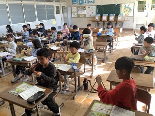 2年生音楽 「森のたんけんたい」楽しく歌おうたった後は、カスタネットやウッドブロック、拍子木、トライアングルなどの楽器で演奏しながら歌いました。