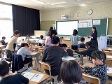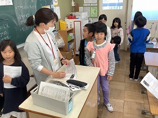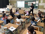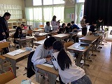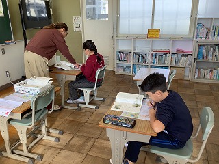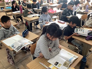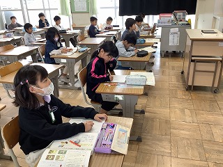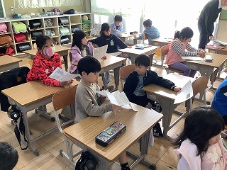 Estudos sociais da 4ª série: Os alunos revisaram seus estudos, desde o controle de enchentes na província de Aichi até a história do desenvolvimento do Porto de Nagoya, e fizeram um teste de unidade.