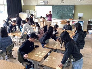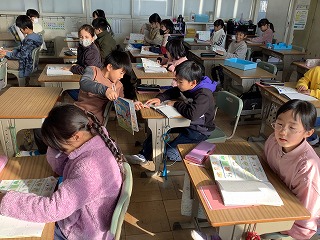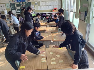 4年生の教室では、新春百人一首大会が行われていました。「春の海」が流れていて和やかな雰囲気でした。