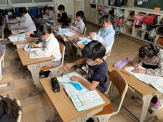 ひまわり 高学年は外国語活動、中学年は書写、低学年はたこあげのたこを作っていました。