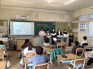 3年生総合 自分の将来の夢について発表練習をしました。漠然と将来の夢を思い描くのではなく、自分の得意なことに目を向け、それを生かしていこうとする思いが伝わる発表でした。 Os alunos do terceiro ano praticaram apresentações sobre seus sonhos para o futuro.Em vez de apenas imaginar vagamente seus sonhos para o futuro, a apresentação transmitiu o desejo de se concentrarem naquilo em que são bons e de tirar o máximo proveito disso.